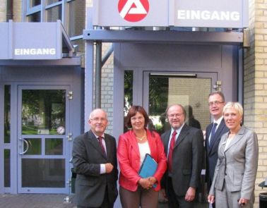 Bettina Hagedorn vor der Arbeitsagentur in Flensburg mit der Leiterin Martina Würker, Thede Boysen, Helmut Trost, der Vorsitzende des SPD-Kreisverbandes Flensburg sowie dem Geschäftsführer der Regionaldirektion Nord der Bundesagentur für Arbeit Jürgen Goecke (v.r.)