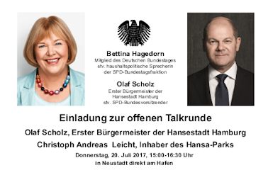 Am Donnerstag, 20. Juli 2017, ist Olaf Scholz zu Gast bei uns am Neustädter Hafen. Gemeinsam mit dem Inhaber des Hansa-Parks Christoph Andreas Leicht diskutieren wir über die strategische Verbindung zwischen der Region Ostholstein und der Metropolregion Hamburg, über die Maritime Wirtschaft und die HANSE-Region. Die Einladung finden Sie hier.