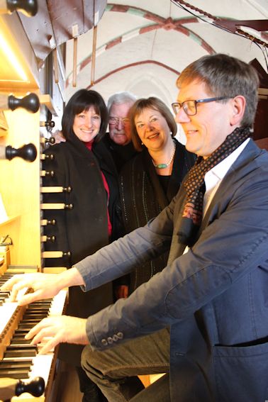 Organist Andreas Brunion präsentiert Bürgermeisterin Dr. Tordis Batscheider, ihrem 2. Stellvertreter Volker Weber und Bettina Hagedorn die Orgel der Stadtkirche in Neustadt in Holstein.