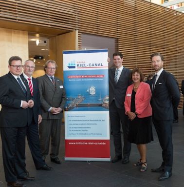 Mit Ralph Müller-Beck (Staatssekretär im Ministerium für Wirtschaft, Arbeit, Verkehr und Technologie des Landes Schleswig-Holstein), Ingo Egloff (Vorstand Hafen Hamburg Marketing e.V.), Andreas Schmidt (Sprecher der Arbeitsgemeinschaft Niedersächsische Seehäfen und Geschäftsführer der Rhenus Midgard GmbH & Co. KG), Johann Bögl (Gesellschafter der Firmengruppe Max Bögl) und Jens Broder Knudsen (Vorsitzender der Initiative Kiel-Canal e.V.)